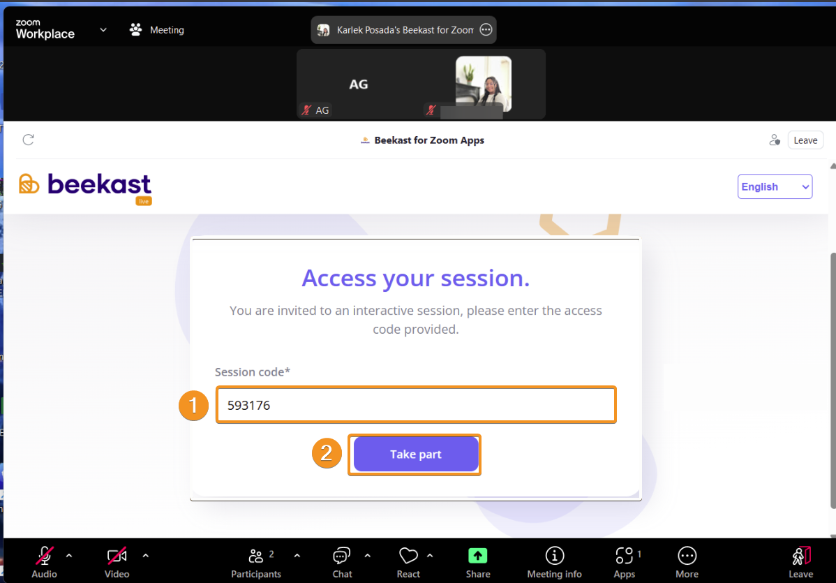 2. This code is to be used via the beeksat.live page that opens when participating in the Beekast session via Zoom.