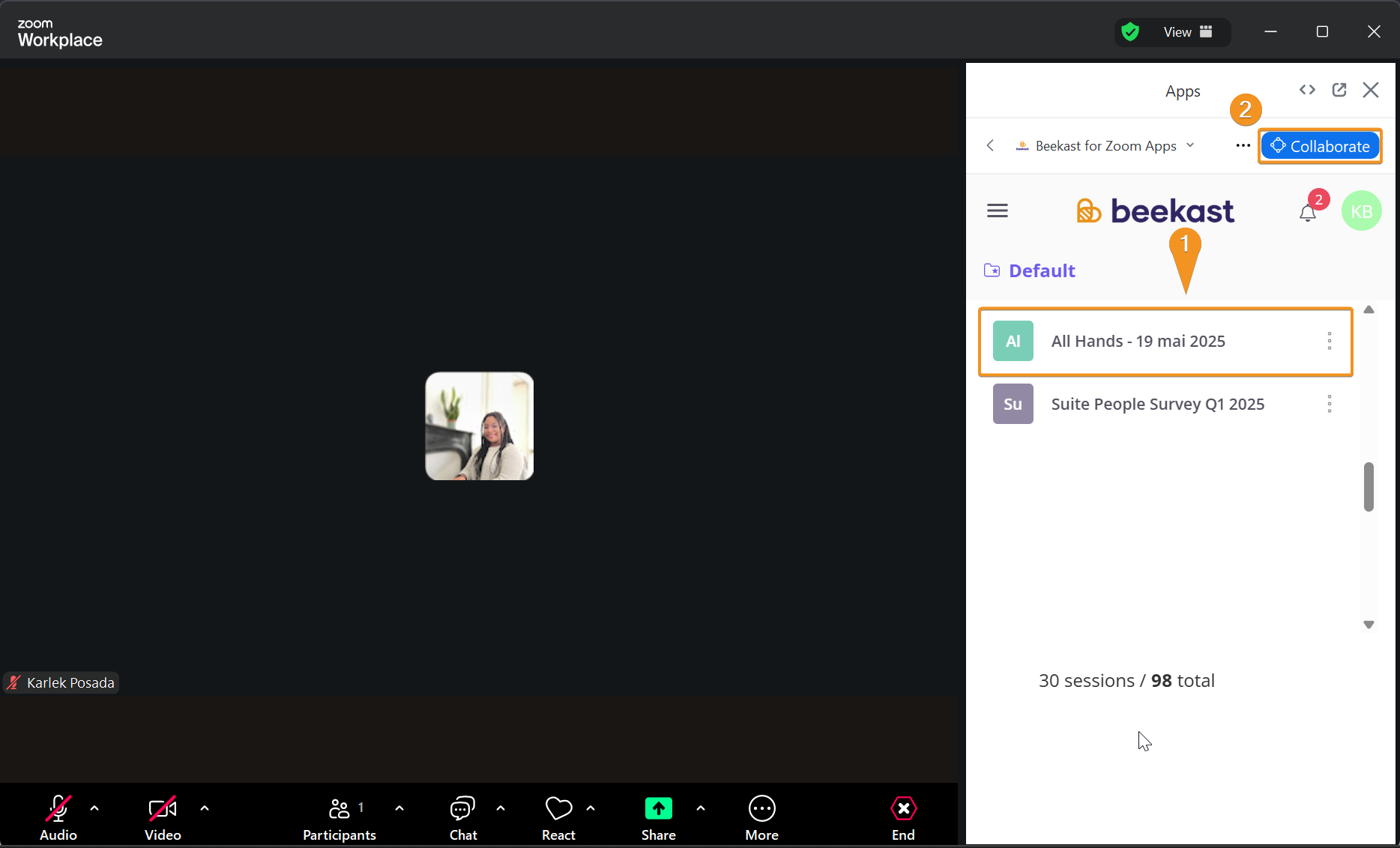 2. Click on ‘Collaborate’. The Beekast session will be displayed directly in the Zoom window, allowing your participants to join it.