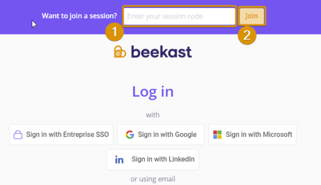 - Email address: identification using your Beekast account (a free account is sufficient). If you are already logged in, you will be automatically directed to the session.
