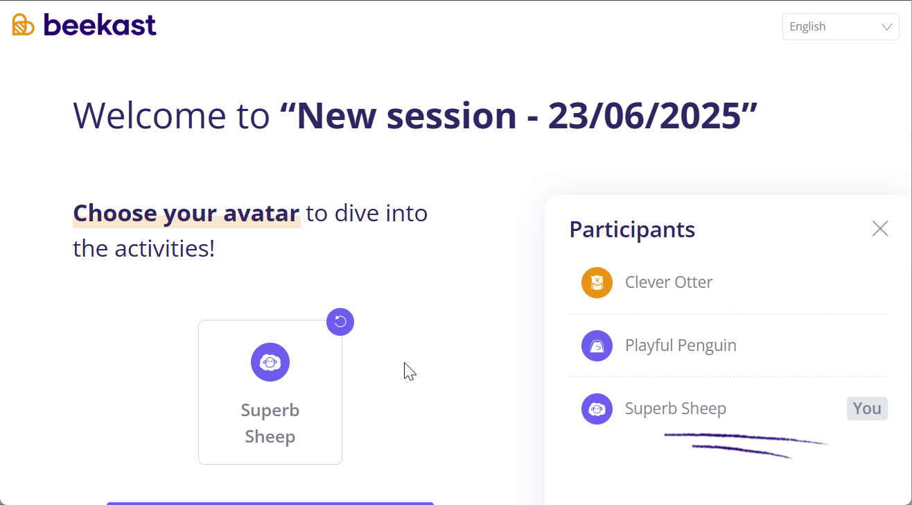 - Avatar: consisting of an animal and an adjective, this is an anonymous way to identify yourself in the session. You can select it randomly when you arrive at the session. Once the avatar has been selected, it cannot be changed.