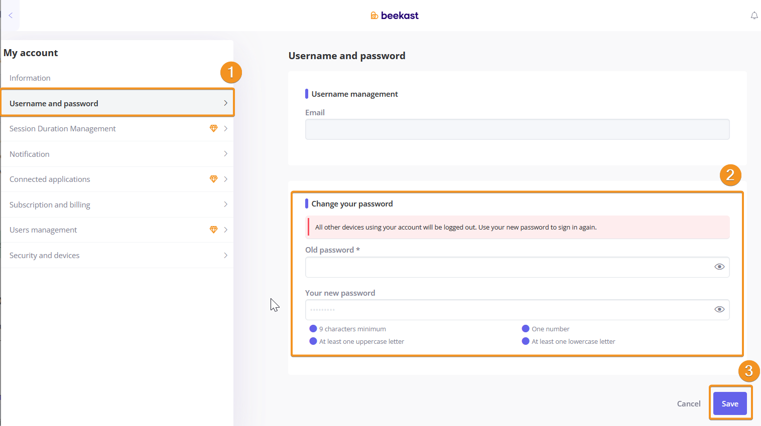 Change my password To change your password: Click on your profile from your avatar at the bottom left, then go to My Account. 1. Click on Username and Password. 2. Fill in the fields ‘Old Password’ and ‘New Password’. The new password must meet the ...
