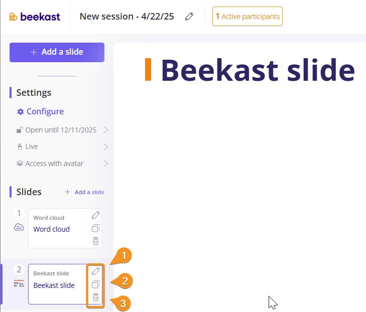 To create a session First step Once you have logged into your account, you will find the “Create a session” option at the top of the page, in the “My sessions” area. You can also start creating your slides by clicking directly on one of the suggested ...