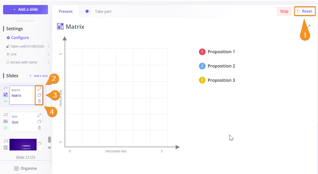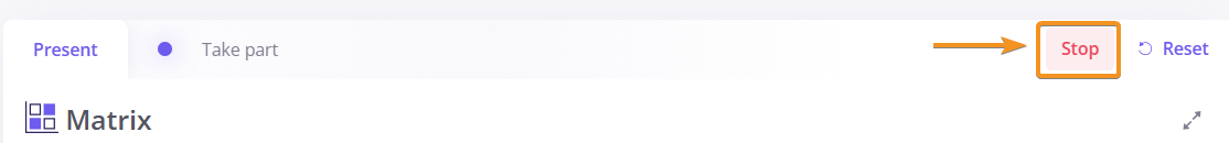 To make your activity unavailable for your participants, you must click on “Stop”, on the top right of the slide.