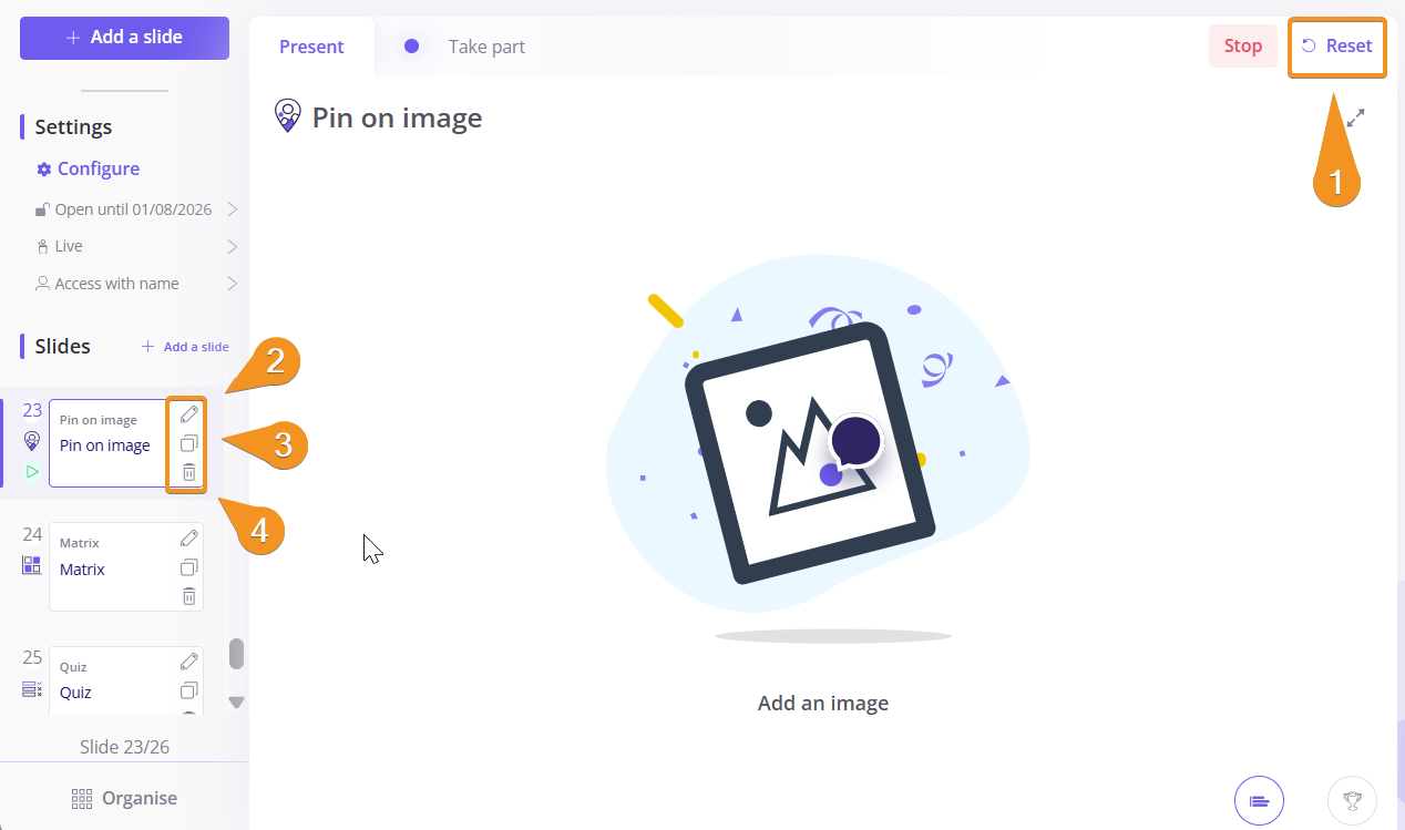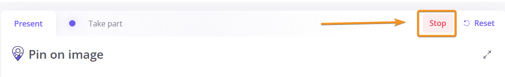 To make the activity unavailable to participants, you can click on "Stop" at the top right of the slide. Participants will then no longer be able to record new answers.
