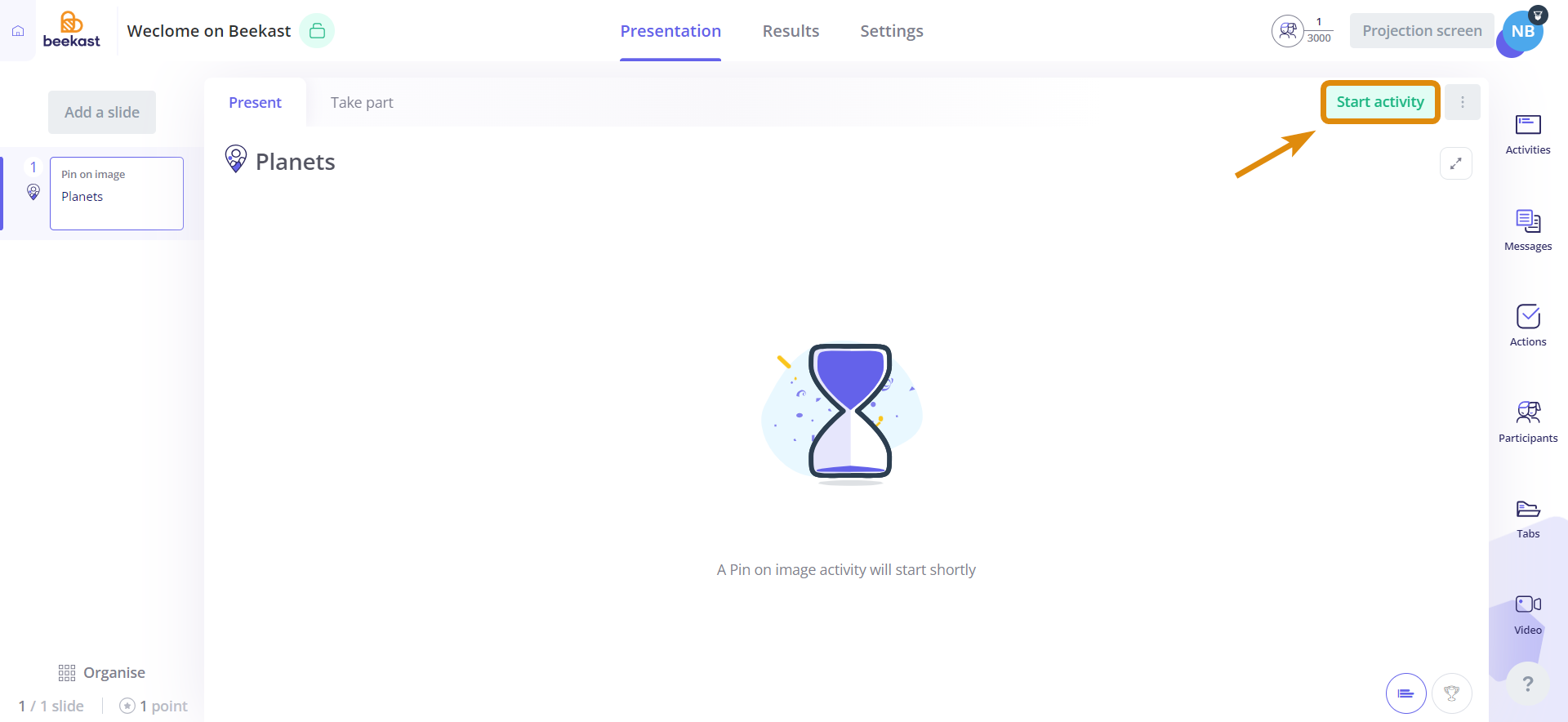 To access the projection screen, click on the Present session button at the top right of your screen. Then click on the "Ranking" icon at the top right of the projection screen.