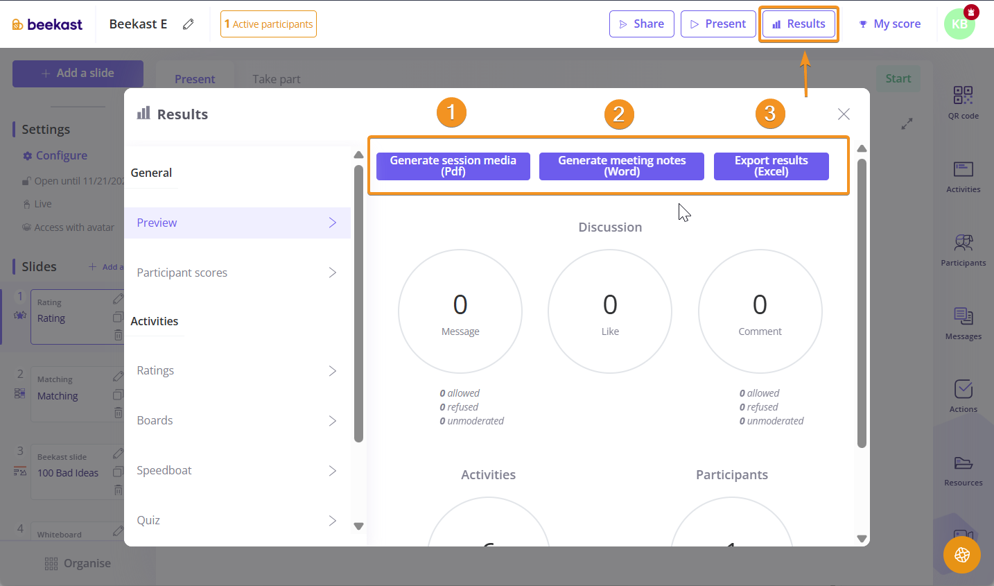 Generate a PDF report of your session to save and share it with your participants! The feature is only available for the owner and collaborator of the session. To generate a PDF report of your session: 1. Click on Results at the top of your session ...