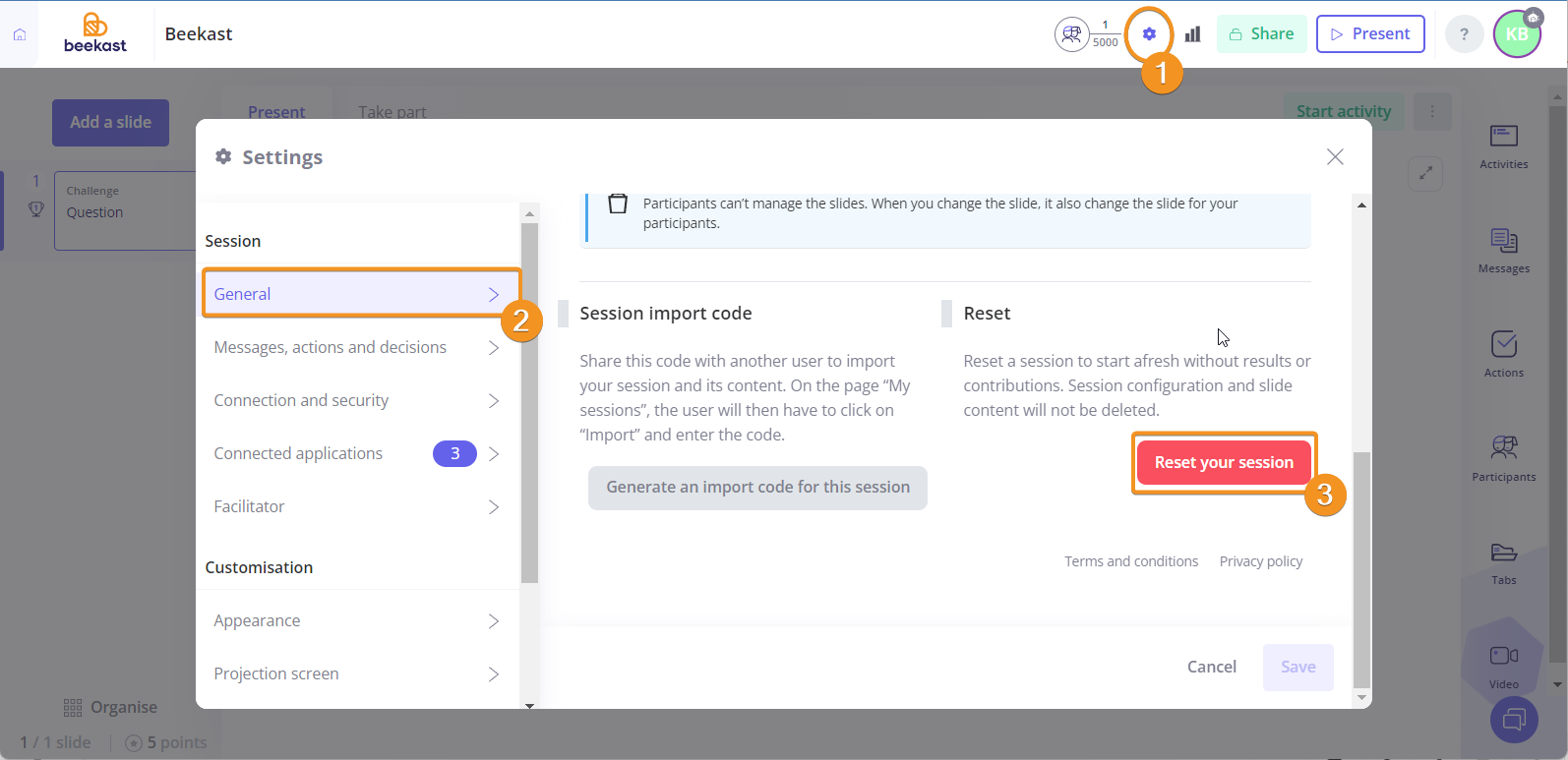 It is possible to import the slides and activities from one of your sessions to another one. This will save you from re-entering numerous questions. To import the slides from another session to your session: 1. Click on “Add a slide” 2. On the ...