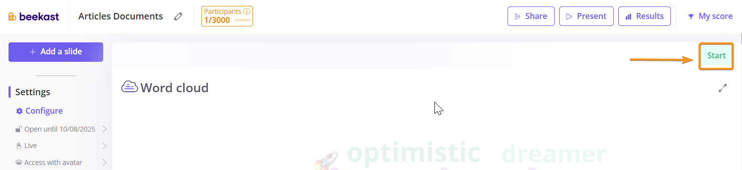 When you click on a slide with an activity, it will be displayed for your participants. In scrolling mode, it is up to you to launch the activity by clicking on Start at the top right of the slide.