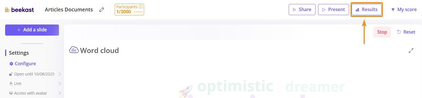 After your session, you can consult the results of the activities carried out with your participants by clicking on the Results button on the top right part of the session.