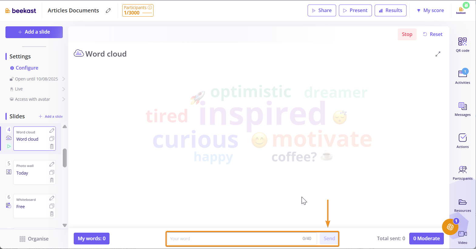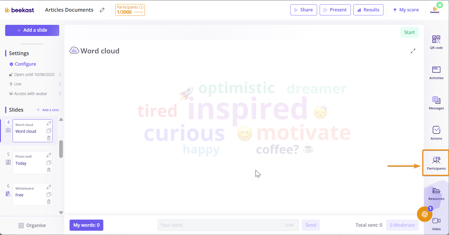 To get your session off to a good start, make sure you have given your participants the public link or session code. Also, make sure that the session has been opened beforehand by the owner!