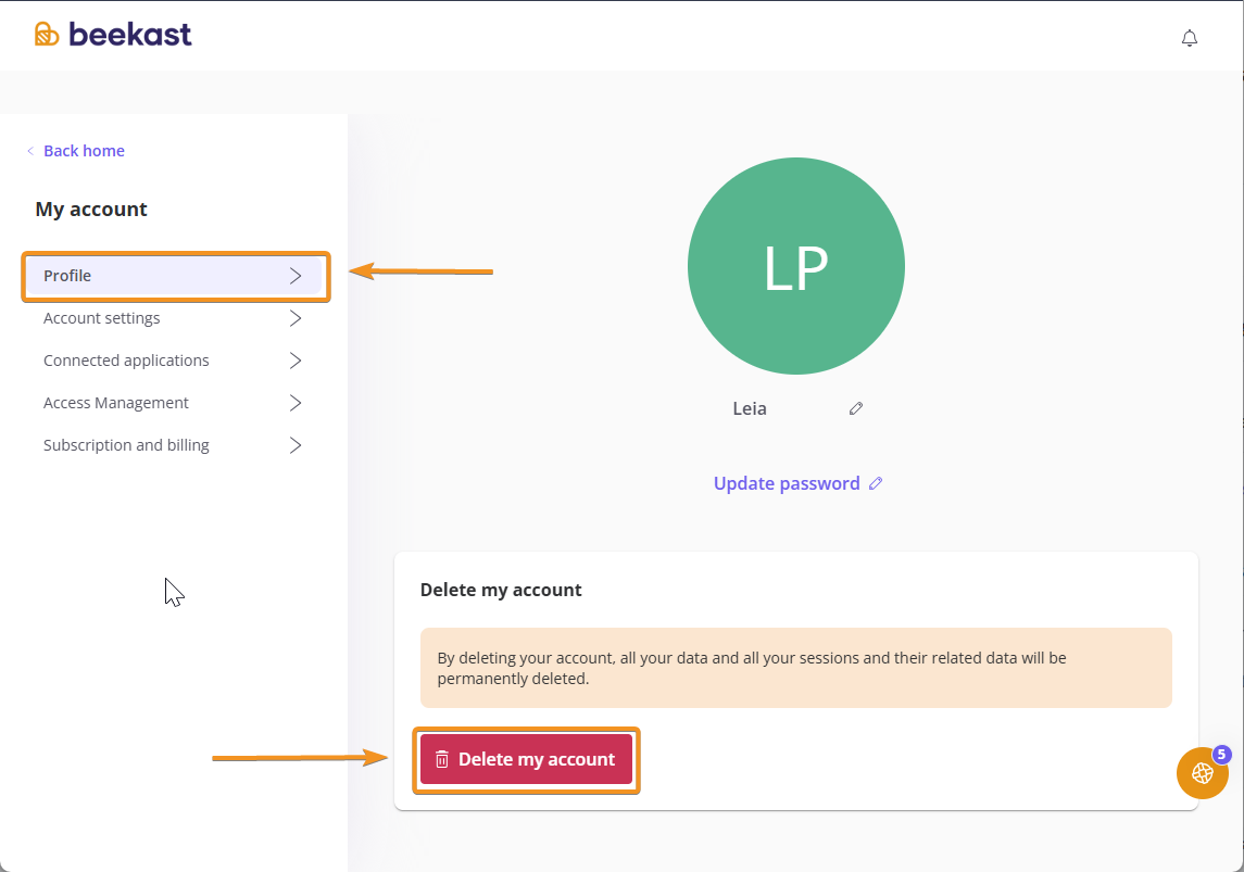 4. In the Profile tab, click on Delete my account.