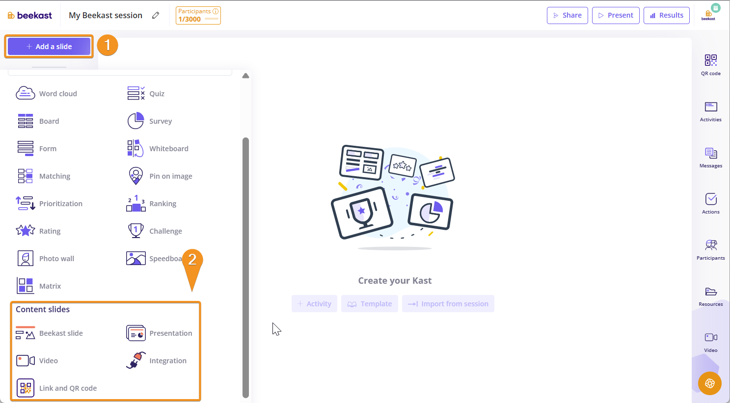 Collect a set of ideas from your audience, structure and rank them based on a vote. You can also create actions and decisions from the idea cards sent by your participants! Add a Board activity To add the activity, click on "Add a slide" on the top ...