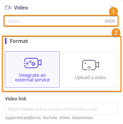 1. Video from a platform: select "Integrate an external service" then copy and paste the video URL into the "Link to video" field.