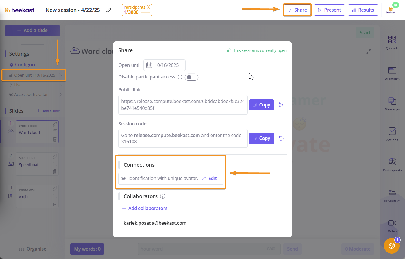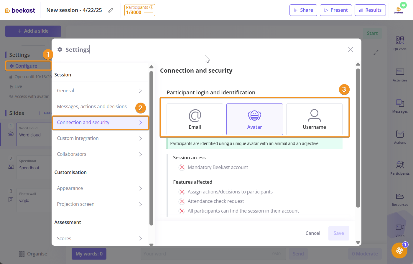 - Access to Beekast features: this mode allows you to take full advantage of the tool's potential. In particular, the attendance list, the actions/decisions, and the possibility for the participant to find back the session at any time from their account.