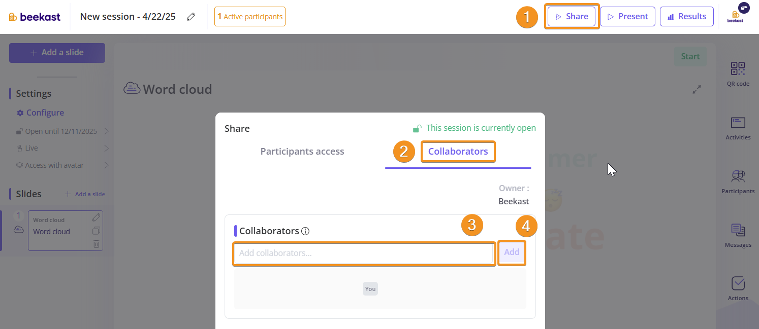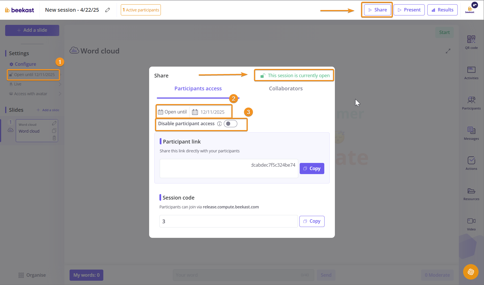 To find the public link for your session, click on the "Share" button at the top right of your Beekast tab. From the pop-up, you can: copy the link and use your own channel to share it with your audience.