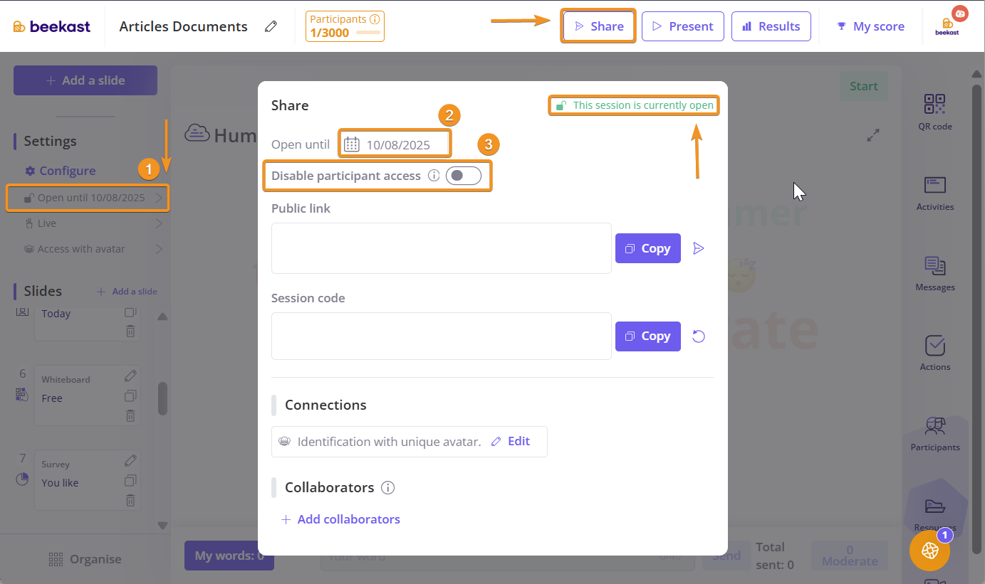 3 - Access control: You have the power to manually close or open access to a session for your participants. Use the "Disable participant access" option to manage session opening with a single click.