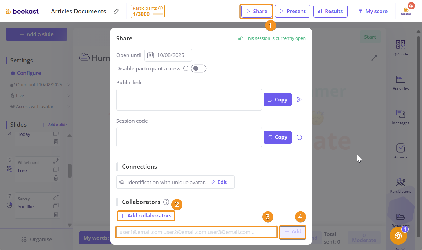 To find the session code, click on the "Share" button at the top right of your Beekast screen. From the pop-up, you can: