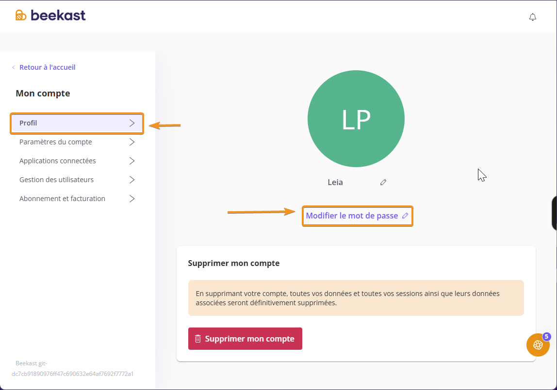 La suppression de compte et ses informations (sessions, résultats, etc.) est définitive. Étapes à suivre : 1. Connectez-vous à votre compte Beekast. 2. Cliquez sur l’icône de votre profil : - en haut à droite si vous êtes dans une session, - ou en ...