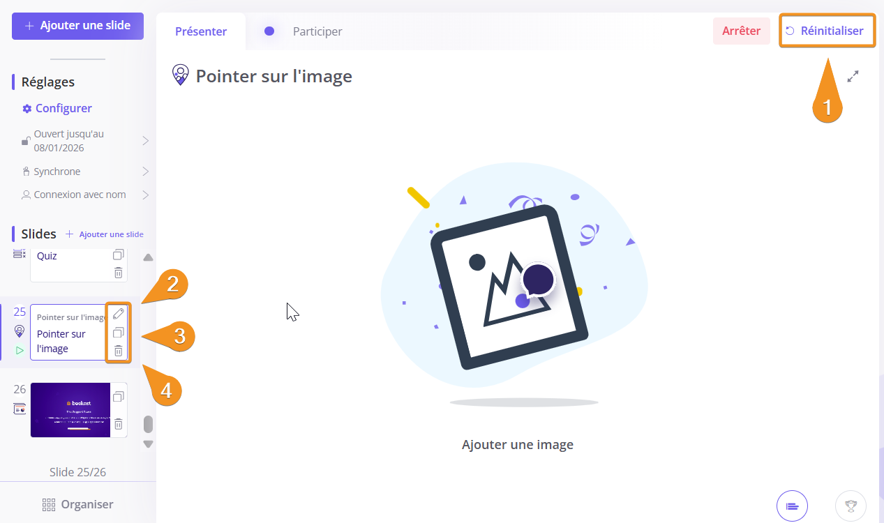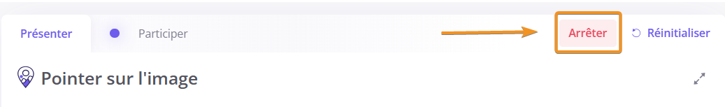 Pour rendre l’activité indisponible aux participants, vous pouvez cliquer sur "Arrêter", en haut à droite de la slide. Les participants ne pourront alors plus enregistrer de nouvelles réponses.