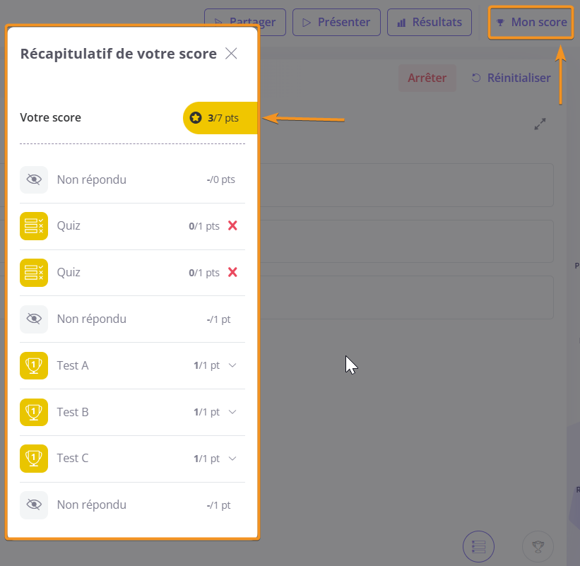 Les points peuvent être affichés par les présentateurs et les participants à l'aide du bouton Mon score, situé en haut de l'écran à côté du bouton Résultats. Une petite fenêtre fournira des informations sur les points gagnés et sur les activités concernées.