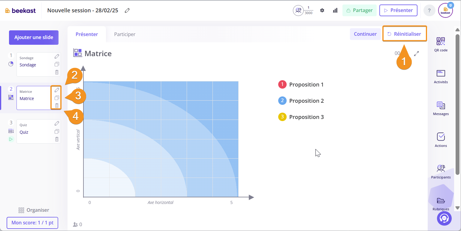 Les points sont placés en temps réel sur la matrice en fonction des choix des participants. Ils devront cliquer sur Valider pour enregistrer leur participation.