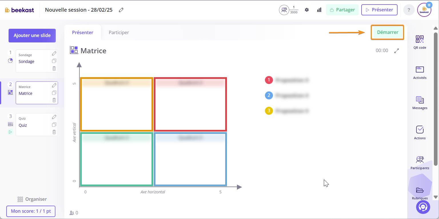 En mode de défilement des slides par l’animateur, vous aurez un bouton pour lancer votre activité, ce qui permettra à vos participants d’y participer. Pour lancer votre activité Matrice, comme toutes les autres activités, cliquez sur le bouton Démarrer en haut à droite.