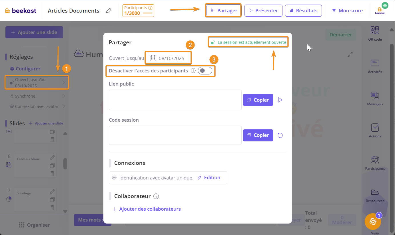 3 - Contrôle d'accès : vous avez la possibilité de fermer ou d'ouvrir manuellement l'accès à une session pour vos participants. Utilisez l'option "Désactiver l'accès des participants" pour gérer l'ouverture de la session en un seul clic.