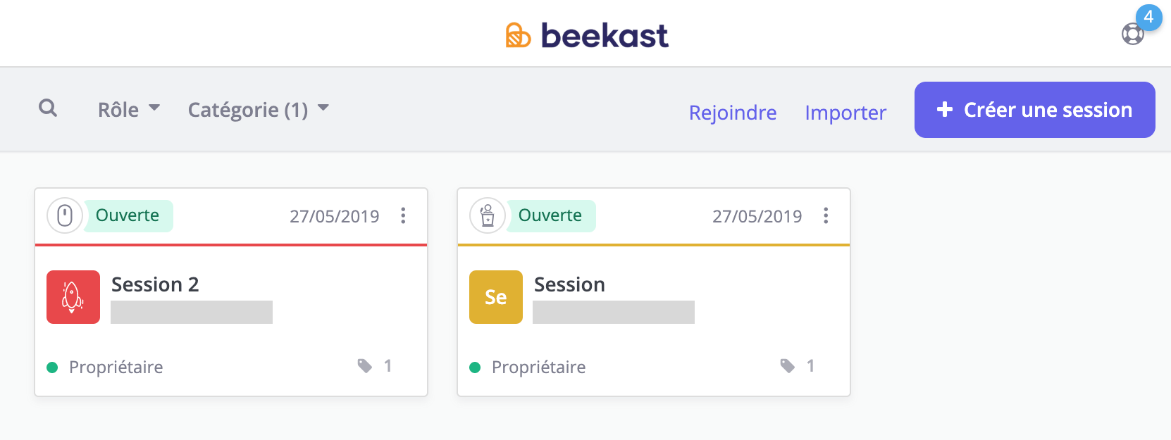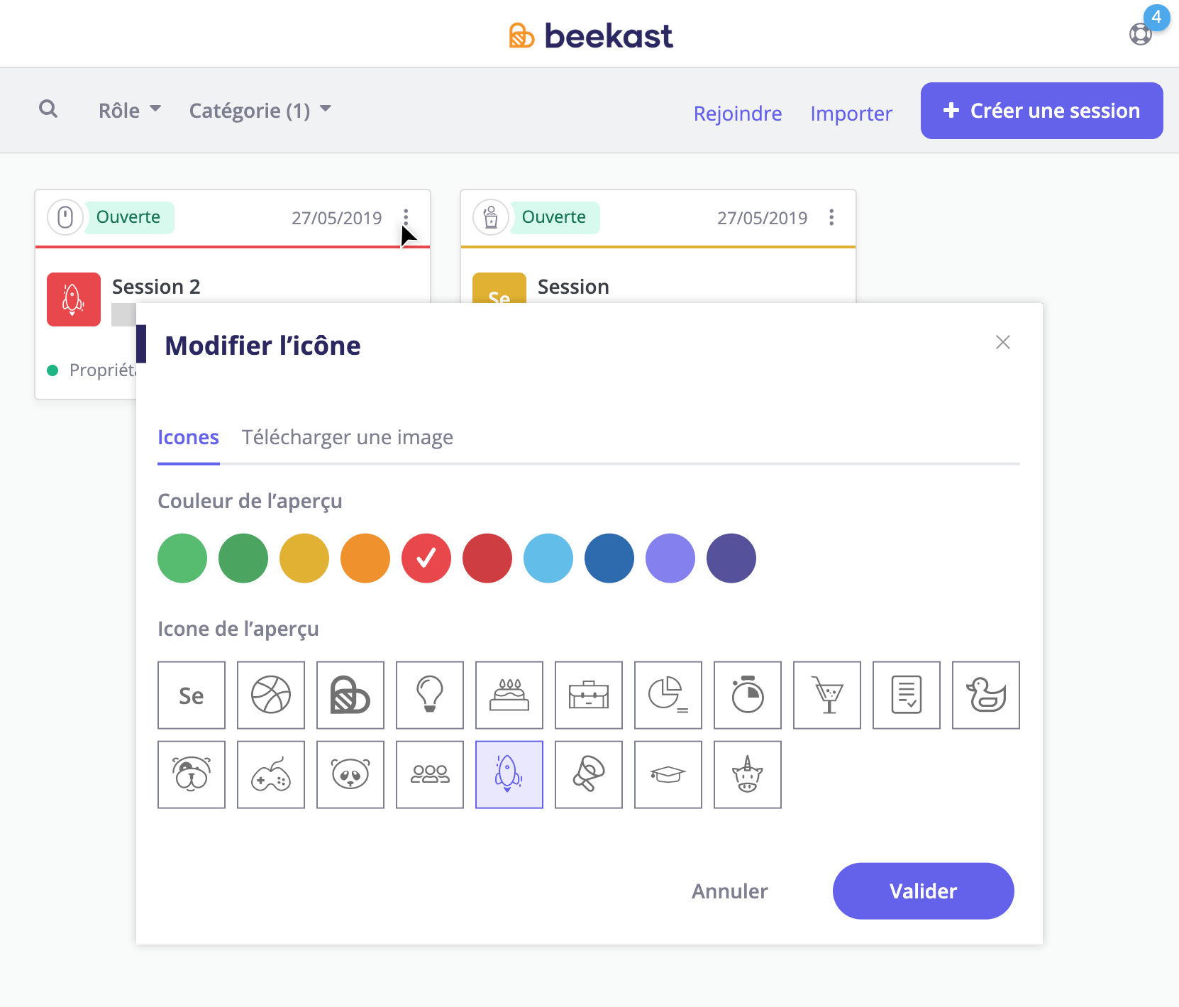 Et comme d'habitude, vous retrouverez toutes les données échangées dans le compte rendu automatique.Cette fonctionnalité représente une grande avancée pour Beekast. Nos équipes de développement sont d'ores et déjà en train de travailler sur ses prochaines grandes évolutions, et notamment : un meilleur suivi des résultats des participants et de nouvelles activités interactives.Nous sommes toujours à l'écoute de vos remarques et suggestions d'améliorations, aussi n'hésitez pas à échanger avec nous (lien support et communauté) et contribuer ainsi à l'évolution de Beekast.AméliorationsNous avons revu la présentation de votre page Mes sessions afin de la rendre plus lisible.Vous pouvez personnaliser la carte de session pour mieux l'identifier en lui attribuant une couleur et une icône (à choisir parmi nos icônes prédéfinies ou en transférant votre propre icône).