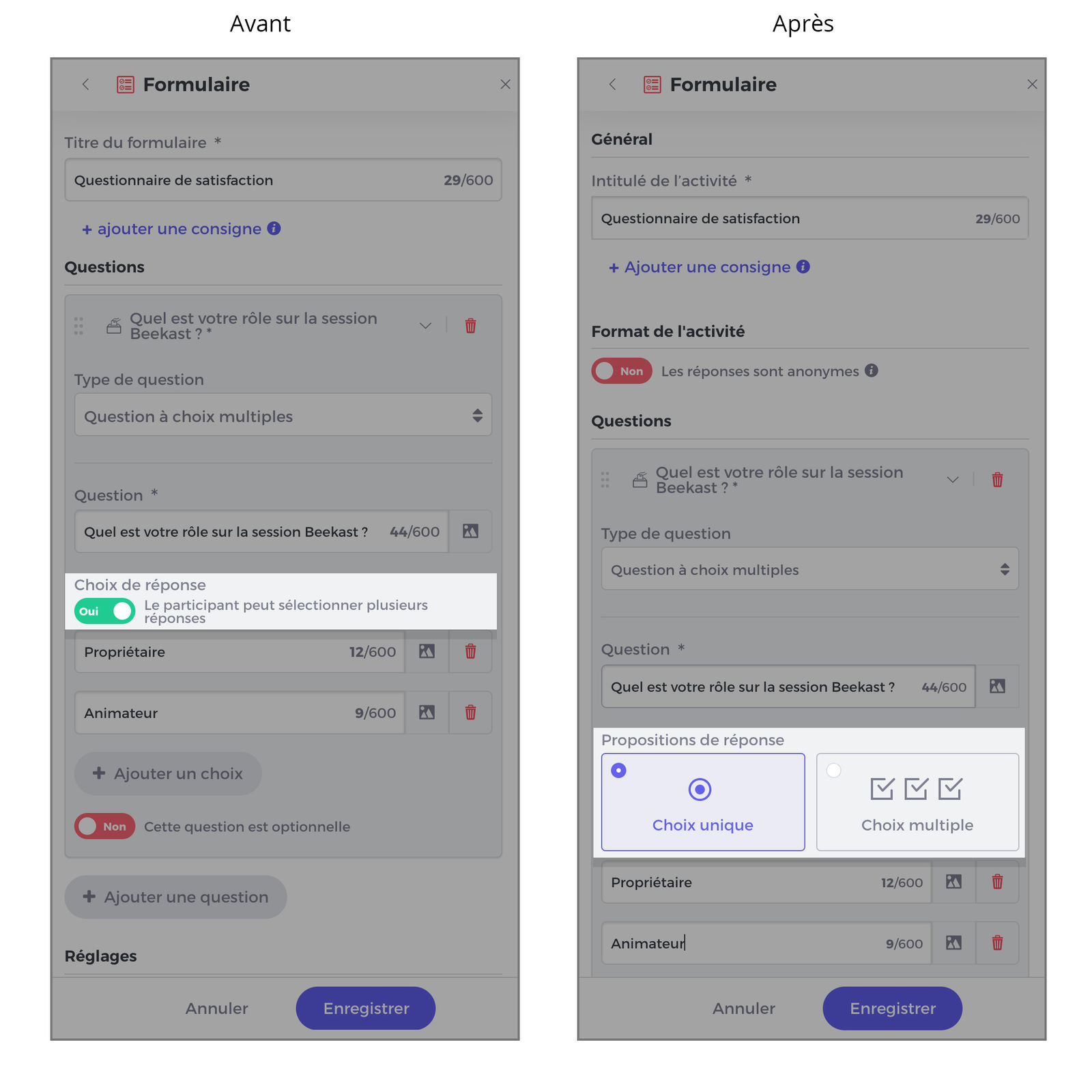 Modification des activités lancéesPour plus de simplicité, vous pouvez désormais modifier toutes les activités même si elles sont en cours :si votre activité ne comporte aucune réponse : vous pouvez tout modifiersi votre activité comporte déjà des réponses : vous pourrez modifier tous les libellés et images, mais pas la structure (type de réponse, ajout / suppression de proposition de réponse, ordre des propositions ...) afin d'éviter de fausser les résultats