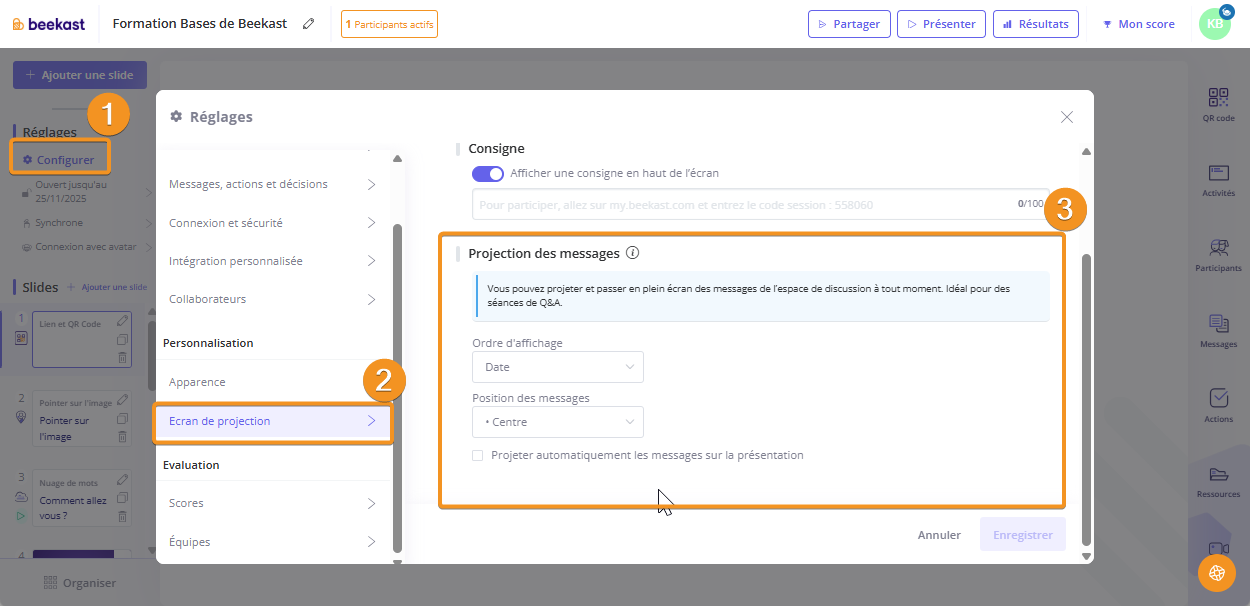 Vous pouvez choisir les messages que vous souhaitez afficher sur votre écran de projection grâce à la projection des messages.